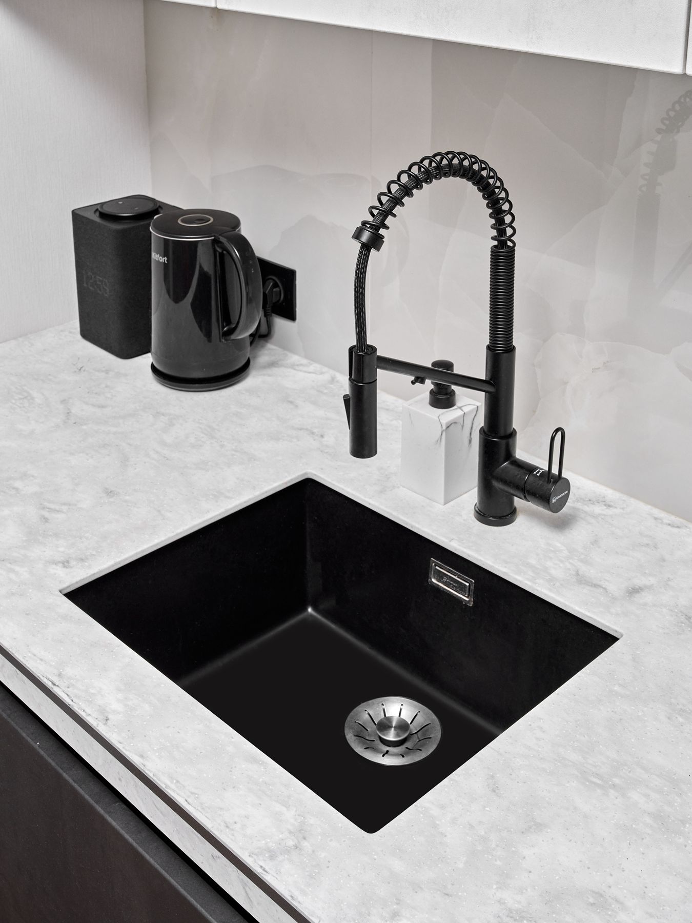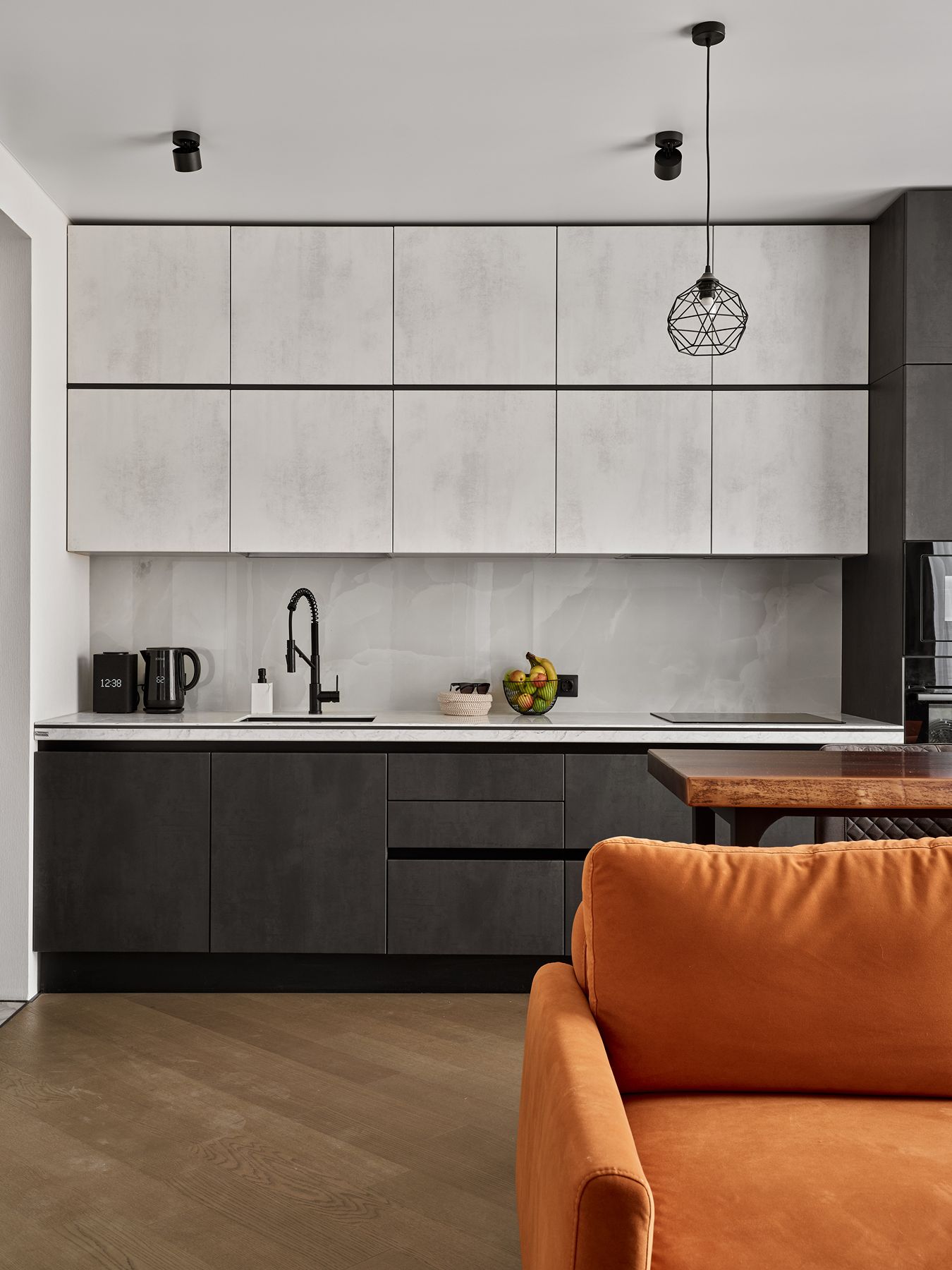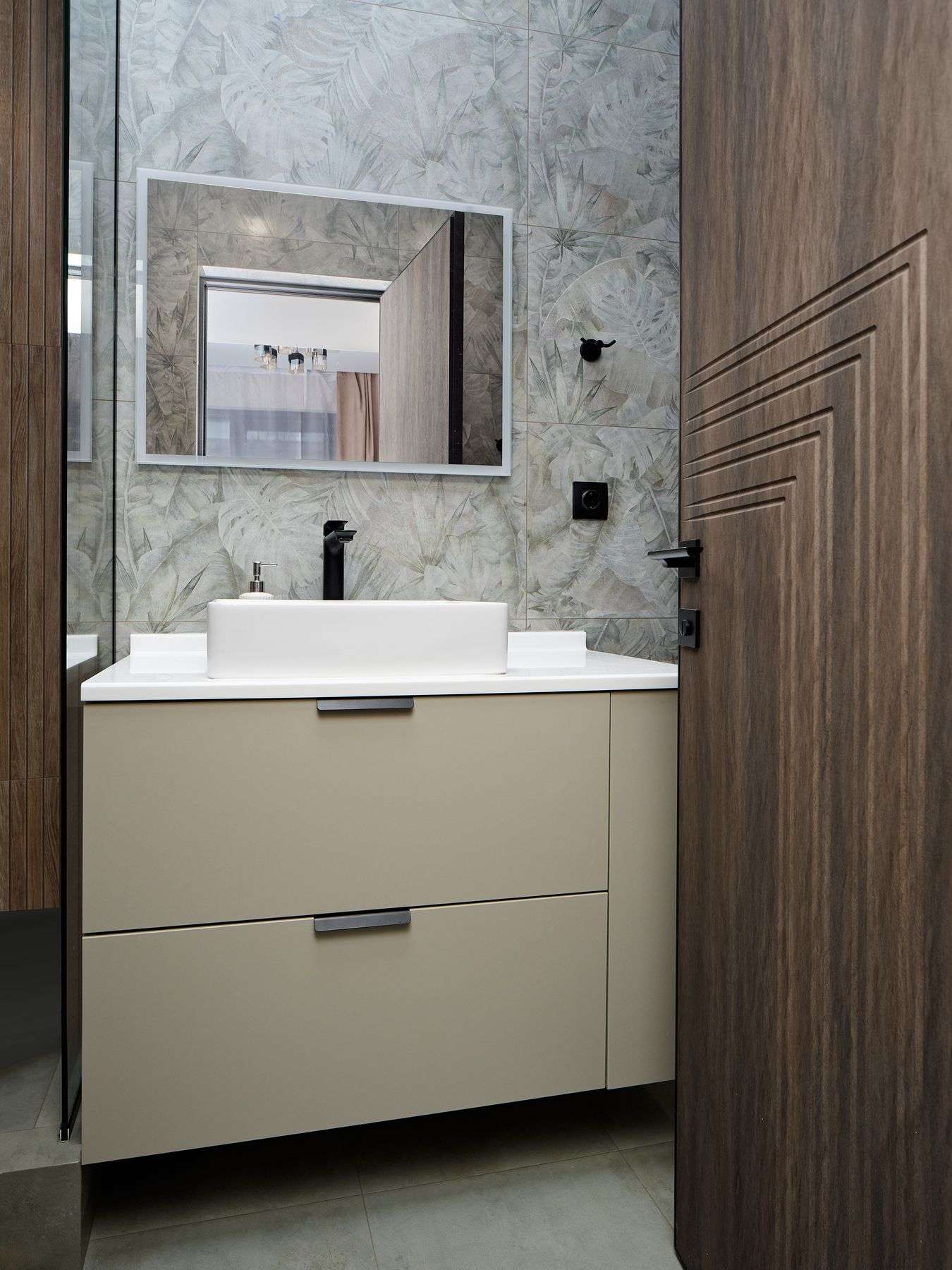 Ключевым элементом стала кухня Teramo с фасадами из прочного термопластика, устойчивого к царапинам и выцветанию. Ее индивидуальность подчеркивает уникальная столешница с черной инкрустацией, которая перекликается с профилем Gola на фасадах. Эргономика продумана до мелочей: глубина столешницы увеличена, а навесные шкафы установлены ниже для удобства хозяйки. В кабинете и спальне установлены шкафы Tokyo с умными решениями: один скрывает док-станцию для робота-пылесоса, а другой маскирует дверь в санузел. В санузлах практичные подвесные тумбы Mix 22 облегчают уборку.