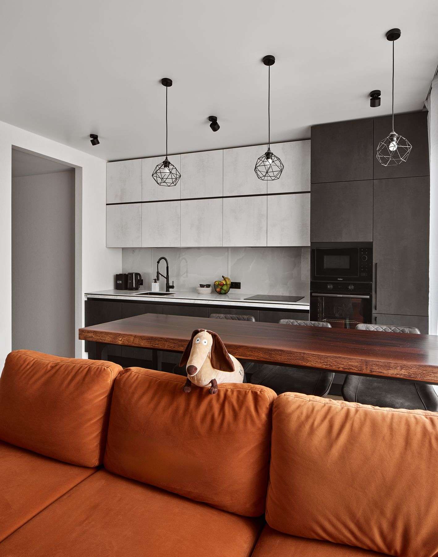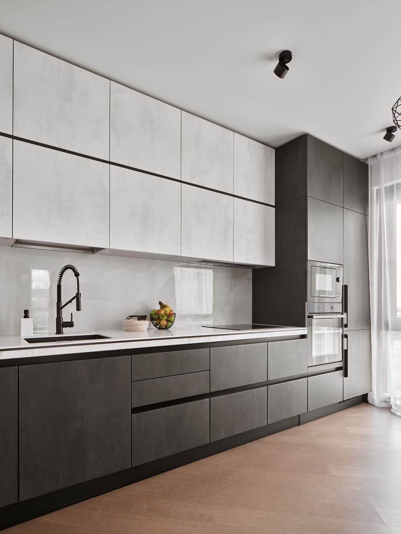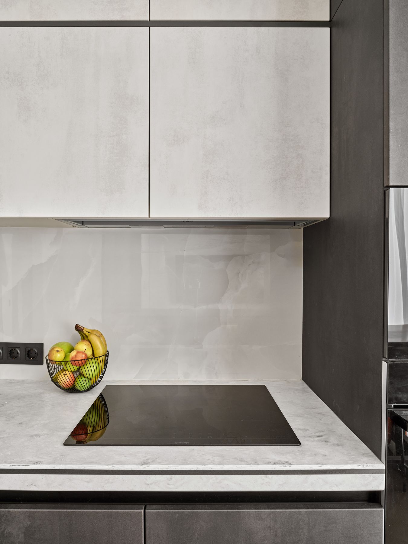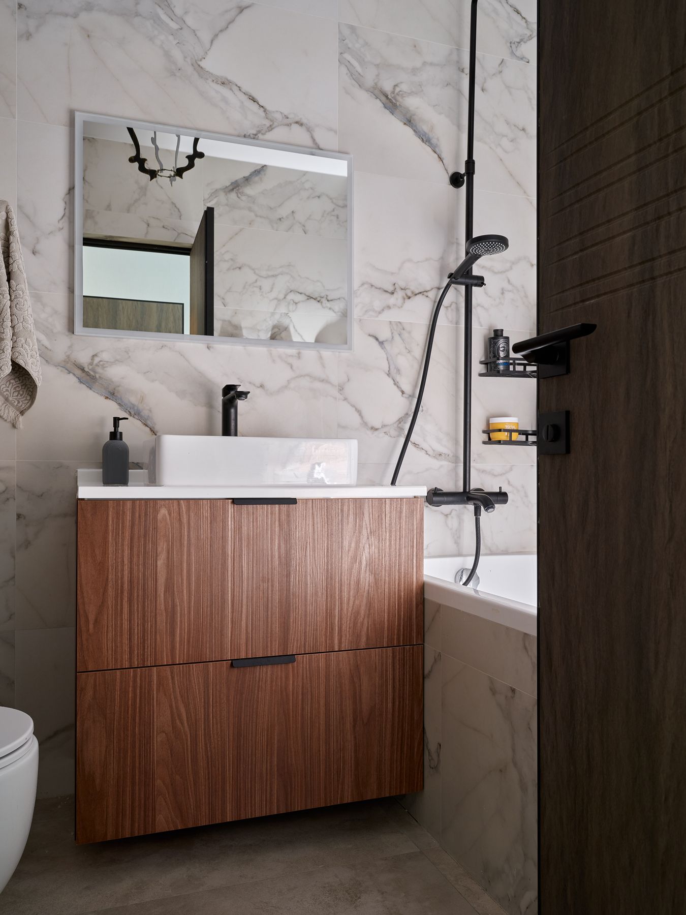 Ключевым элементом стала кухня Teramo с фасадами из прочного термопластика, устойчивого к царапинам и выцветанию. Ее индивидуальность подчеркивает уникальная столешница с черной инкрустацией, которая перекликается с профилем Gola на фасадах. Эргономика продумана до мелочей: глубина столешницы увеличена, а навесные шкафы установлены ниже для удобства хозяйки. В кабинете и спальне установлены шкафы Tokyo с умными решениями: один скрывает док-станцию для робота-пылесоса, а другой маскирует дверь в санузел. В санузлах практичные подвесные тумбы Mix 22 облегчают уборку.